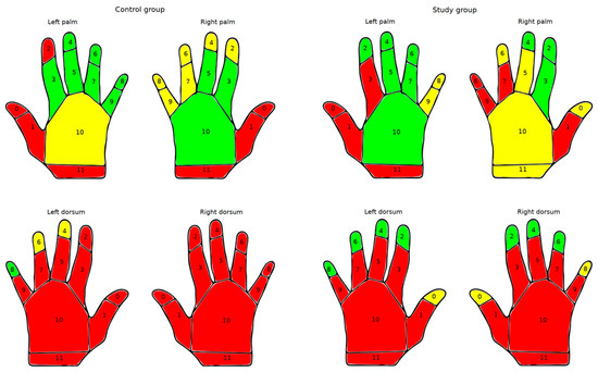 Figure 5 shows the detailed error rates for both the control and intervention groups for various areas of the hand surface. The data are visualized in a regional model, indicating areas where less than 5% of participants presented an error in coverage of greater than 0.5 cm2 in green, areas where 5–10% presented this error in yellow, and areas where more than 10% of participants presented this error in red.