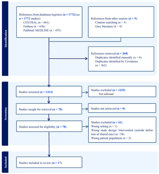 Seventeen studies were selected for inclusion in the systematic review, focusing on eHealth interventions in digital prostate cancer shared care (Table 1). These studies were chosen based on keyword-based search strategy and predefined inclusion criteria.