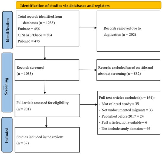 The systematic literature search resulted in a total of 1235 records. Following the deletion of duplicates, 1033 studies were eligible for the screening of abstract and title, after which, 832 were excluded based on the pre-defined criteria, in this case, the focus on access, utilization, and outcomes of SRHRs and services amongst undocumented migrants. After full-text screening of the remaining studies, 37 articles were included and underwent critical appraisal and analysis. The record selection process can be found in the flowchart in Figure 1.