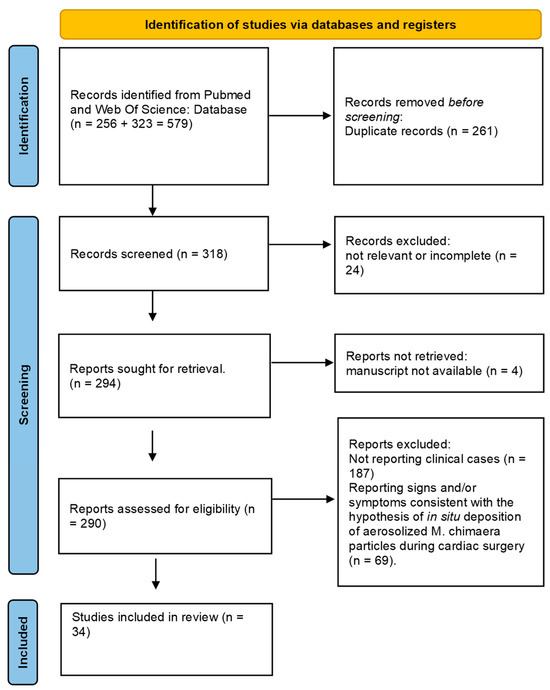 The 290 eligible articles were deemed eligible and re-screened for inclusion. An established diagnosis of M. chimaera infection without clinical manifestations in the cardiac tissue/district after cardiac surgery or atypical clinical manifestations after other surgical intervention not using HCU or involvement of other organs or tissues not consistent with the hypothesis of in situ deposition of aerosolised M. chimaera particles, emerged in 34 articles (377 patients) (Table 1).