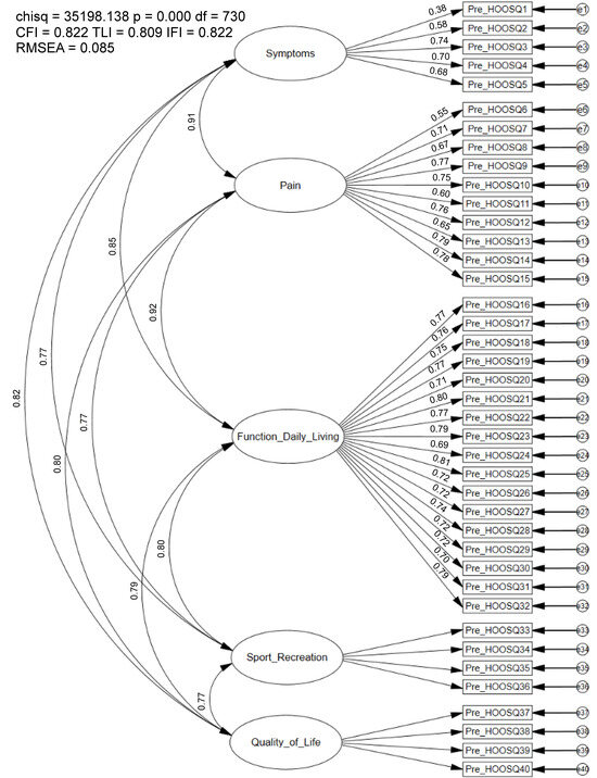 Despite the current use of the HOOS (e.g., approved outcome measure for reimbursement purposes following THA), complete and robust psychometric analysis of the scale in a large dataset of patients for which the scale is designed has not been performed. As such, there is a need to conduct a CFA on the full scale to test the hypothesized factor structure of the 40-item HOOS to ensure that the items are appropriate indirect measures of the hypothesized latent constructs in a large, targeted sample of patients seeking care for the hip (e.g., THA) [
