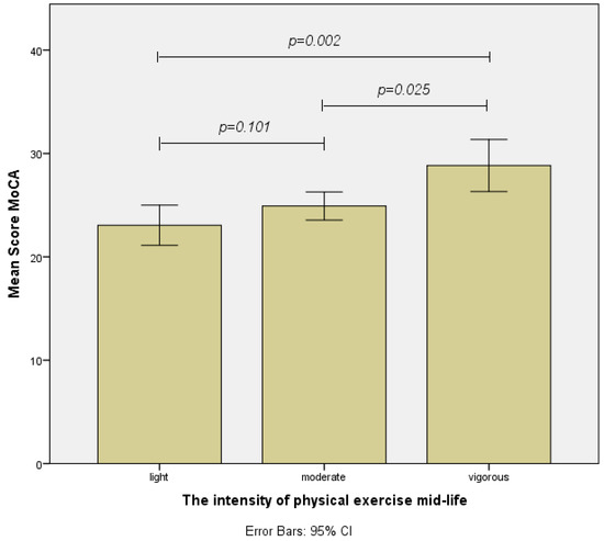 Our One-Way ANOVA demonstrated that there were significant differences between the three intensity groups F(2,57) = 5.094, p = 0.009. The LSD post hoc analysis showed that there were significant differences between the MoCA scores of individuals who participated in high-intensity exercise and those who participated in moderate exercise (MD = 3.917, p = 0.025). Moreover, significant differences were also observed between the high-intensity group and the light-intensity group (MD = 5.778, p = 0.002). On the other hand, no significant difference was observed between light- and moderate-intensity groups (MD = 1.861, p = 0.101) (Figure 1). A further analysis of statistically significant or non-significant differences between the three exercise intensities during middle age can be seen in Figure 1.