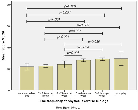 In addition, significant differences were also observed between MoCA total scores of individuals who participated in physical exercise at a frequency of two to three times per month, and groups with a frequency of three to four times a week (MD = 5.495, p < 0.001), five–six times a week (MD = 6.429, p = 0.001), and every day (MD = 6.929, p = 0.005). However, a non-significant difference was reported between the group of participants with a physical exercise frequency of two to three times per month and the group who exercised once or twice a week (MD = 1.540, p = 0.233).