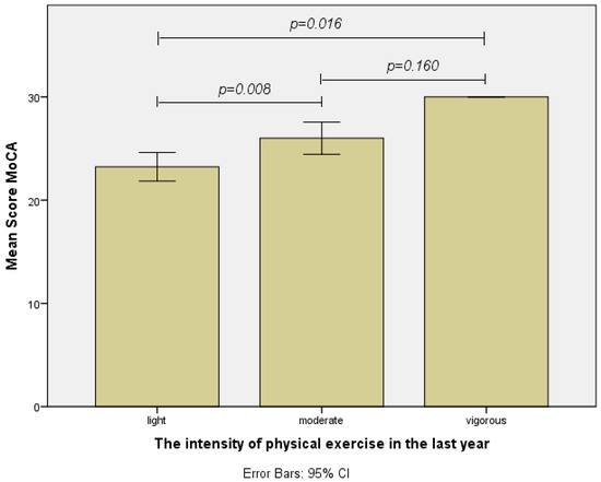 Regarding the last calendar year, the statistical analysis revealed that there were significant differences between the total MoCA scores of individuals from the three intensity groups F(2,57) = 5.700, p = 0.006. Furthermore, the post hoc analysis showed significant differences regarding the total MoCA score between individuals who participated in light exercise and those who participated in moderate exercise (MD = 2.676, p = 0.008). Moreover, significant differences were observed between the light-intensity group and the high-intensity group (MD = 7.676, p = 0.019). This time, no significant difference was observed between the high-intensity and moderate-intensity groups (MD = 4, p = 0.160) (Figure 3).