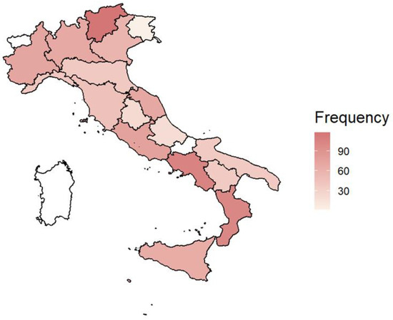 A cohort of 973 children (469 females, 48%) was enrolled across the five primary school grades (i.e., first grade, n = 159, 16%; second grade, n = 126, 13%; third grade, n = 268, 28%; fourth grade, n = 219, 23%; and fifth grade, n = 201, 21%) throughout Italy. The age range was 5 to 11 years (mean age = 8.53 years, standard deviation = 1.41). The geographical distribution is reported in Figure 1. Among respondents, 417 (43%) came from regions recently exposed to extreme environmental and climate change events (e.g., flooding, seismic events, wildfires, drought). The survey items are reported in Table 1, Table 2, Table 3 and Table 4.