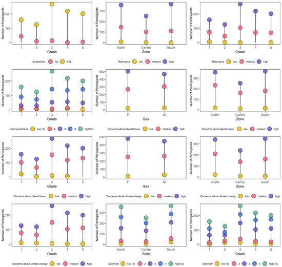 The main findings are graphically summarized in Figure 2. Children’s awareness was very high across the entire sample: 901 children (93%) have heard about climate change. Awareness steadily increased from 72% in first-grade children to 93% in second-grade children, χ2(16) = 14.66, p < 0.001. Perceived relevance was reported as high by 615 children (63%). Significant variations were detected by zones: 255 children (70%) from the south reported climate change challenges to be very relevant, a higher percentage when compared to counterparts from the north (59%) and the center (60%), χ2(4) = 15.01, p = 0.005. Moreover, the percentage of children rating climate change as an irrelevant topic decreased from 4% among first-grade students to 0% among third-to-fifth-grade children, χ2(8) = 21.81, p = 0.005. Within the tested sample, 40% of children (n = 388) reported feeling very connected to climate change challenges. Connectedness was higher in younger children (43 to 46% for those in first to third grades) compared to older ones (29% for those in fifth grade), χ2(16) = 37.55, p = 0.002. Only 44 children (5%) reported not being concerned whatsoever about the planet’s future. This percentage was higher in those enrolled in the first grade (n = 115, 72%), χ2(8) = 57.98, p < 0.001. Among females, the percentage of children highly concerned was greater than among males, respectively, 47% vs. 35%, χ2(2) = 14.66, p < 0.001. As for zones, 185 children (51%) from the south reported being highly concerned about the planet’s future, a percentage that was lower among children from the north (35%) and the center (36%), χ2(4) = 23.02, p < 0.001. Less than half of the sample was specifically concerned about climate change, n = 414 (45%). This percentage was greater among females (47%) than males (42%), χ2(2) = 8.36, p = 0.015, as well as among children from southern Italy (53%) compared to counterparts from the north (38%) and the center (42%), χ2(4) = 19.69, p < 0.001. While up to 9% of the sample reported not being worried at all, this percentage was significantly lower from third grade onward (between 2 and 3%), χ2(8) = 24.42, p = 0.002. A relatively large proportion of children (n = 389, 40%) reported sleep difficulties because of recursive thoughts about the climate. This percentage was significantly higher among females, n = 230 (46%), compared to males, n = 159 (34%), χ2(1) = 13.94, p < 0.001, as well as among children from the south, n = 173 (47%), compared to counterparts from the north, n = 134 (38%) and the center, n = 82 (33%), χ2(2) = 14.99, p < 0.001. A similar percentage of children (n = 378, 39%) disclosed at least one climate-related nightmare during the last months with no significant differences by gender, zone, and grade.