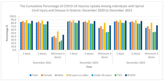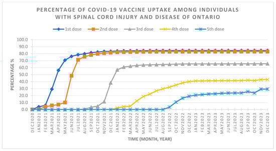 The COVaxON database records all COVID-19 vaccines administered in Ontario in its real-time centralized vaccine information system, which also collected information on the date and location of administration, product type, and dose number. We extracted records of vaccination for the SCI/D cohort from December 2020 to December 2023. To evaluate the uptake of the vaccine, we calculated the percent of individuals within the cohort who received 0 to 5 doses by monthly evaluation. Vaccination full coverage was classified as at least 2 doses, with 3+ doses classified as additional booster doses [9,10,11,12,13,14,16]. Vaccination uptake was stratified and evaluated by the following sociodemographic characteristics: injury type (TSCI vs. NTSCD), sex (males vs. females), and age (under 65 years vs. 65 years and over).