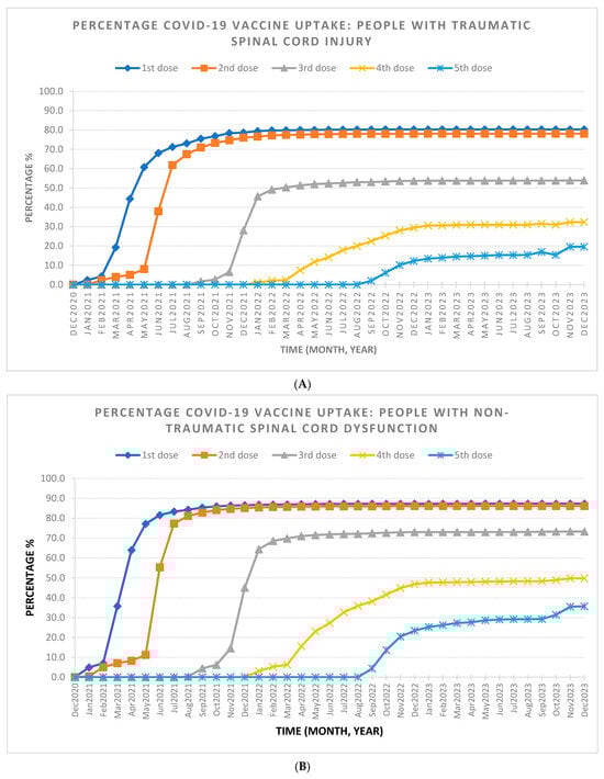 The percentage of COVID-19 vaccine uptake from December 2020 to December 2023 for people with traumatic and non-traumatic spinal cord-injuries and dysfunction living in the community setting. (A) The percentage of COVID-19 vaccine uptake for people with traumatic spinal cord-injuries (TSCI). Total population in the TSCI group is 1414. At the end of December 2023, percentage of COVID-19 vaccine uptake is 80.3% for first dose, 78.1% for second dose, 53.9% for third dose, 32.3% for fourth dose, and 19.6% for fifth dose. (B) The percentage of COVID-19 vaccine uptake for people with non-traumatic spinal cord dysfunction(NTSCD). Total population in the NTSCD group is 2142. At the end of December 2023, percentage of COVID-19 vaccine uptake is 87.3% for first dose, 86.1% for second dose, 73.3% for third dose, 49.8% for fourth dose, and 35.7% for fifth dose.