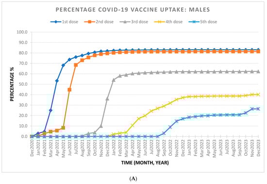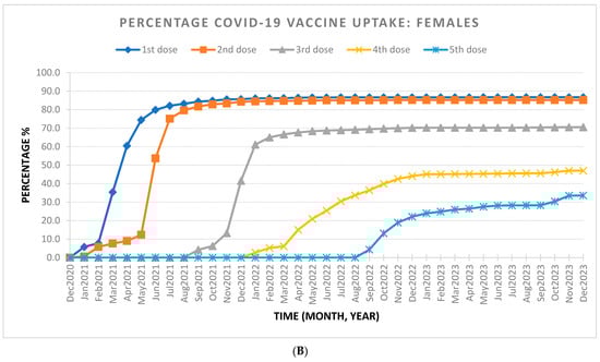 The percentage of COVID-19 vaccine uptake from December 2020 to December 2023 based on gender for people with traumatic and non-traumatic spinal cord-injuries and dysfunction living in the community setting. (A) The percentage of COVID-19 vaccine uptake for males. Total male population is 2142. At the end of December 2023, percentage of COVID-19 vaccine uptake is 83.1% for first dose, 81.4% for second dose, 62.3% for third dose, 40.1% for fourth dose, and 26.4% for fifth dose. (B) The percentage of COVID-19 vaccine uptake for females. Total female population is 1432. At the end of December 2023, percentage of COVID-19 vaccine uptake is 86.7% for first dose, 85.2% for second dose, 70.5% for third dose, 47.0% for fourth dose, and 33.6% for fifth dose.