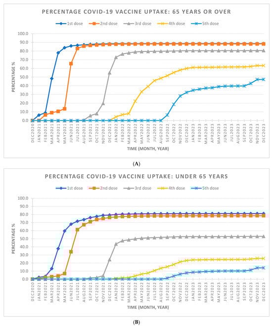 The percentage of COVID-19 vaccine uptake from December 2020 to December 2023 based on age for people with traumatic and non-traumatic spinal cord-injuries and dysfunction living in the community setting. (A) The percentage of COVID-19 vaccine uptake for 65 years old and over. Total 65 years old and over population is 1637. At the end of December 2023, percentage of COVID-19 vaccine uptake is 88.6% for first dose, 88.2% for second dose, 80.6% for third dose, 63.2% for fourth dose, and 47.3% for fifth dose. (B) The percentage of COVID-19 vaccine uptake for under 65 years old. Total under 65 years old population in the spinal cord-injured group is 1937. At the end of December 2023, percentage of COVID-19 vaccine uptake is 81.1% for first dose, 78.5% for second dose, 52.9% for third dose, 25.7% for fourth dose, and 14.0% for fifth dose.