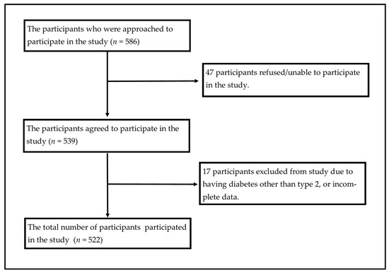 A total of 539 DM patients were interviewed to collect the required data, among which 17 were excluded as they did not provide the required cost information or they had GDM or T1DM confirmed diagnoses written on prescriptions by their physicians (Figure 1). The study included 522 participants, with a slightly higher representation of females (54.0%) compared to males (46.0%). The majority of participants were between the ages of 41 and 60 years (64.0%), followed by those older than 60 years (18.4%) and those 18–40 years (17.6%). Most participants were married (93.5%), with a small percentage being single (3.4%) or divorced/widowed (3.1%).
