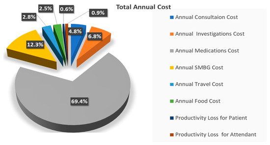 The chronic nature of DM and its progressively increasing prevalence has made it a major contributor to the global economic burden, which can be reduced by the proper management of the main contributing factors to its high management cost. Cost of illness analysis provides a basic understanding of various components of the cost that contribute to the economic burden of disease, which can be utilized to plan strategies to reduce the financial impact of disease. Hence, the current study explored the economic burden of management of T2DM in Pakistan utilizing cost of illness methodology. The total mean annual cost per person was USD 235.1, with mean annual direct costs amounting to USD 231.6 and mean annual indirect costs, mainly due to productivity loss, amounting to USD 3.5. These results also highlighted the significant financial impact on individuals due to direct medical costs, amounting to about USD 219.2 with the majority contribution by medication costs (USD 163.2).