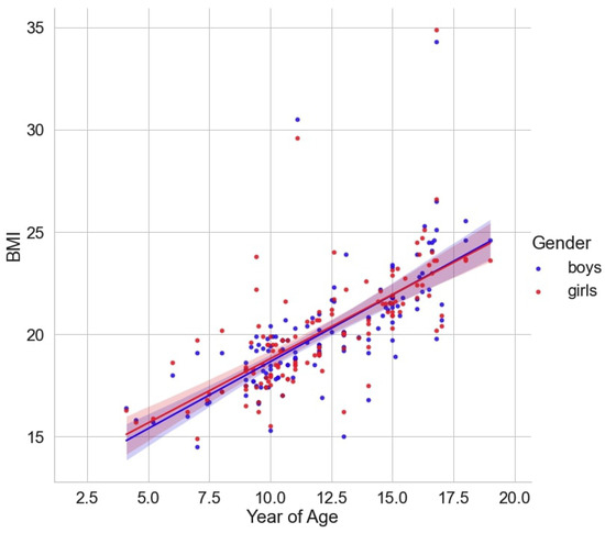The regression analysis showed linear growth in BMI with advancing age. The mean BMI value was around 15 kg/m2 in 5-year-olds, and it rose to nearly 24 kg/m2 at 18–19 years. According to the model, BMI was close to the threshold of overweight (25 kg/m2) in late adolescents. In both sexes, the association between age and BMI was positive (r = 0.6718; p < 0.05), but it was tighter in boys (see Figure 1). The findings reflected trends in original longitudinal studies that indicate an increase in BMI with age [133]. This dynamics could be associated with a lack of nutrition literacy in children. Consequently, the pediatric population chooses calorie-dense foods and prefers sedentary activities in their free time.