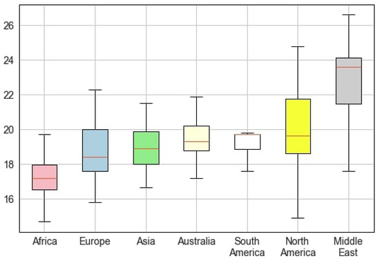 We noted a high variability in pediatric BMI among different regions (see Figure 2). The lowest BMI was in children in Africa (17.12 ± 1.35 kg/m2), and the highest was in North America (20.49 ± 2.80 kg/m2). The range of BMI values was narrower in South America and wider in the Middle East, North America, and Europe. The distribution of BMI values was almost symmetric in most continents, but it was skewed toward higher values in South America. The data on different continents were reported disproportionally. We found 70 papers that covered information on North America, 67 on Europe, 27 on the Middle East, 17 on Asia, 13 on Australia/Oceania, 11 on Africa, and 8 on South America. The lowest BMI values were observed in Europe and the Middle East (15.8 kg/m2), and the maximal level was also reported in the Middle East (34.6 kg/m2).