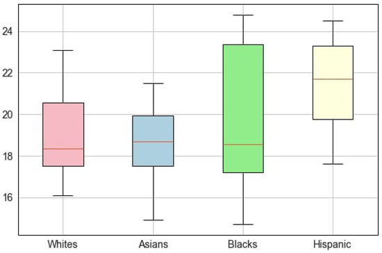 BMI differed significantly among races/ethnicities (Figure 3). Hispanic children had the greatest BMI (22.04 ± 3.29 kg/m2), while Asians showed the lowest index value (18.64 ± 1.92 kg/m2). Blacks had the largest variability in BMI compared among all races, although the number of articles that reported findings on Blacks was smaller than those reporting on Whites (50 vs. 16, respectively). Hence, the number of articles did not influence the final result, and we obtained reliable information on the dispersion of data across races/ethnicities.