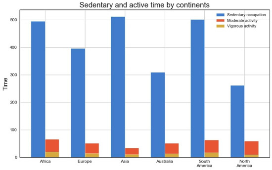 Sedentary and active time by continent (%).