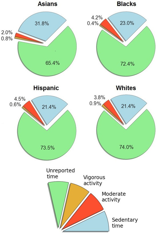 Among four racial/ethnic groups, Black children were the least active (see Figure 6). Asians, Hispanics, and Whites did not exhibit a pronounced difference in sedentary time (see Table 1). In all racial/ethnic groups, the amount of MPA and VPA was low compared to sedentary time. This is evident from the absolute number (see Table 1) and the shares of time for different activities (see Figure 6).