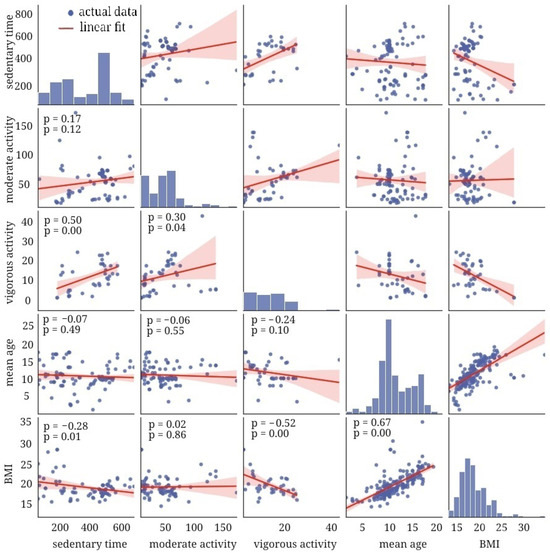We found a positive correlation between the ratio of moderate-to-vigorous PA and BMI (r = 0.47; p < 0.01). Because of the marked age-related change in BMI, we also focused on the dynamics of PA while a child is growing. The age-related dynamics in PA were also an issue in the current study. Age exhibited a pronounced inverse correlation with the proportions of vigorous and total PA with sedentary time (r = −0.57; p = 0.0002 and r = −0.53 p = 0.0006, respectively; see Figure 7 and Figure 8). In general, children become less active with age, and, reasonably, their BMI rises.