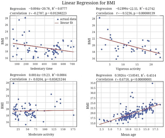 Physiological and biochemical outcomes of PA could explain the tendencies in body-mass parameters. We observed a marked negative correlation between BMI and VPA (r = −0.52, p = 0.0009), VPA-to-sedentary time proportion (r = −0.51; p = 0.0061), and the proportion of total PA to sedentary time (r = −0.50; p = 0.0069). Long-lasting PA stimulates lipolysis; this is mainly true for light-intensity training. Hence, the lighter the endurance training is, the lower the weight is expected to be and vice-versa. However, most studies do not report findings on the amount of light-intensity training in the population.