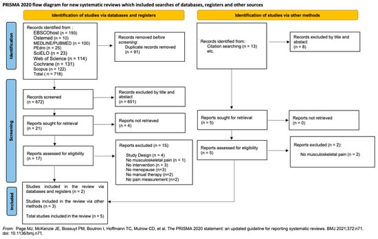 After defining the search terms, based on the Medical Subject Heading (MESH) descriptors, the following terms were used: menopause* OR perimenopause* OR postmenopause* AND musculoskeletal diseases OR pain OR arthrit* OR rhemat* OR osteoarth* OR tendInitis OR sciatica OR lumbago OR fibrositis* AND manual ther* OR osteopath* OR chiropract* OR myofascial release OR craniosacral therapy OR musculoskeletal Manipulations OR neuromuscular therapy OR trigger point. The search strategy used is shown in Appendix A.