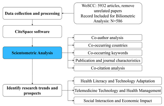 To ensure the authenticity and comprehensiveness of the data sample, after multiple search experiments, the topic (TS) field was used for data retrieval, and the search string was set to the following: (TS = ((“the elderly” OR “elderly” OR “elderly people” OR “senior citizens” OR “seniors” OR “aged” OR “older adults”) AND (“telemedicine” OR “telehealth” OR “mHealth” OR “eHealth” OR “digital health” OR “smart healthcare”))). The search time range was set to all years, the language was restricted to English, and only the document types “article” and “review article” were included in the study, yielding 5932 articles from WoSCC. The search date was 13 June 2024. To ensure the accuracy of the study, the following were excluded: (1) conference abstracts and book chapters, (2) reports and design work, (3) personal interview reports, conference news, newspapers, conference speeches, and other articles, and (4) incomplete literature and articles irrelevant to the research topic. While the search results may not include all articles on elderly telemedicine, the criteria used identified high-quality articles that effectively represent its trends and status in the medical industry. Figure 1 illustrates the literature screening and research framework process.