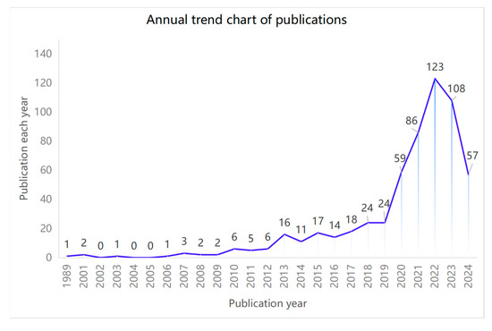 The Web of Science search yielded a total of 5932 papers, which were then refined through data cleaning to include 586 papers in the final analysis. These papers originated from 252 countries or regions, were published across 246 journals, and were authored by 2750 individuals. Figure 2 illustrates the annual publication trends, revealing a gradual increase in the number of papers on telemedicine for the elderly since the first paper in 1989, reaching 24 publications in 2019. Notably, there was a sharp rise in publications from 2020 to 2022, accounting for 64.16% (376/586) of all publications, despite a slight decrease in 2023. This four-year period exhibits a peak point in research output, with a significant focus on public health, health technology, and electronic health literacy in 2022, largely influenced by the COVID-19 pandemic. The annual publication numbers and trends are visually represented in Figure 2, providing a clear overview of the research landscape in this field.