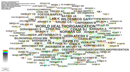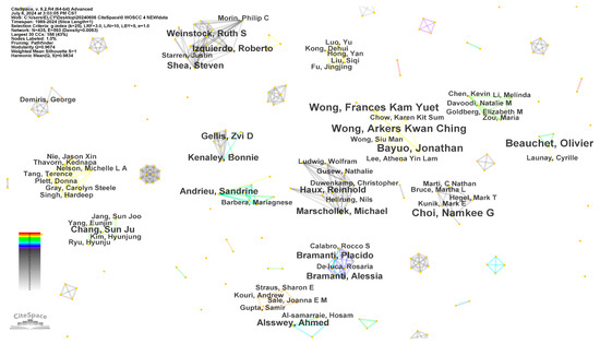 Author co-citation analysis identifies and visualizes the intellectual structure of a research field by examining how frequently authors are cited together in the relevant literature [17]. Figure 7 presents the author’s co-citation network for the period 1989–2024, which consists of 755 nodes and 2434 links. In this network, nodes represent authors, while the connections between them signify co-citation relationships. The thickness or color of these connections indicates the strength or frequency of co-citation. Excluding anonymous authors, the most frequently cited individuals in the fields of telemedicine for the elderly are the World Health Organization (95 citations), Choi NG (64), Norman CD (62), Venkatesh V (60), Czaja SJ (59), Davis FD (56), Wildenbos GA (55), and Lam K (53). These authors have demonstrated significant influence and strong research relevance, establishing themselves as core researchers in the field of telemedicine for the elderly. Their contributions play a crucial role in advancing the knowledge base and shaping the development of telemedicine for the elderly.