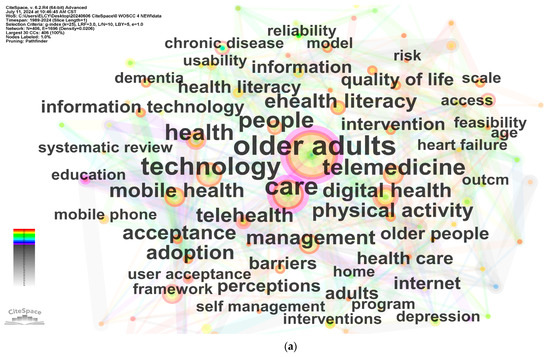 To present the research hotspots in recent years more clearly, a keyword clustering co-occurrence network timeline analysis was also conducted on the literature from 2019 to 2024, as shown in Figure 5c. Clusters have different lifespans, with the largest cluster in 2019–2024, Cluster 0 “physical activity”, shown at the top of the view. This largest cluster has more than 48 members and is slightly less homogeneous than the smaller clusters in terms of Silhouette score. In this study, the review focuses mainly on seven clusters: “physical activity”, “mobile health”, “technology acceptance”, “telemedicine”, “elderly people”, “elderly care”, and “digital health literacy”. These clusters have acceptable Modularity (Q = 0.3625 > 0.3) and Silhouette (S = 0.7059 > 0.6) scores. Based on the frequency of occurrence, the top five keywords are older adults, care, technology, telemedicine, and health.