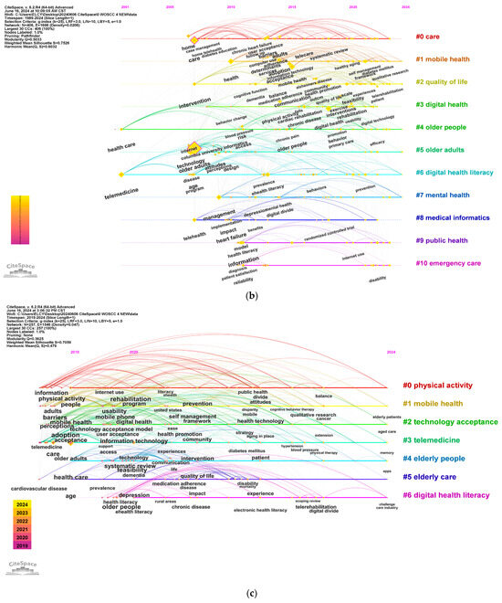 The co-occurrence analysis, as shown in Figure 5a, examines the frequency of keywords from 1989 to 2024. The top 10 most frequently used keywords, presented in the format “keyword (frequency count)”, are as follows: “older adults (243)”, “care (120)”, “technology (98)”, “telemedicine (62)”, “health (58)”, “people (56)”, “mobile health (52)”, “telehealth (50)”, “management (49)”, and “digital health (44)”. The timeline visualization in the figure is presented as a horizontal timeline, with clusters arranged from left to right and vertically in descending order of size [21]. The colored curves represent the co-citation links added in the corresponding year, and large nodes covered in red indicate citation bursts or highly cited cases [21]. The timeline analysis between 1989 and 2024 has a Modularity score of Q = 0.5033 (>0.3) and a Silhouette score of S = 0.7301 (>0.6), as shown in Figure 5b. The seven larger clusters identified between 2001 and 2024 are “care”, “mobile health”, “quality of life”, “digital health”, “older people”, “older adults”, and “digital health literacy”, with the largest cluster, Cluster 0, having 51 members.