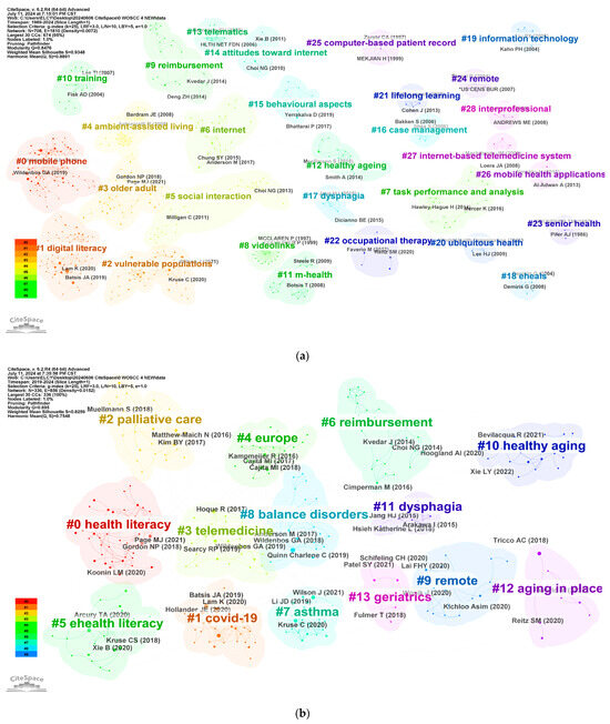 To gain further insights into the latest trends in telemedicine for the elderly, we analyzed commonly cited references from 2019 to 2024 and their corresponding clusters, as depicted in Figure 8b. By examining the evolution of the network, it became evident that telemedicine garnered significant attention in 2019 and 2020, largely due to the COVID-19 pandemic. In recent years, researchers have increasingly focused on topics such as technology acceptance, e-health literacy, and medical interventions. The co-citation network diagram revealed 19 clusters with substantial Modularity (Q = 0.695) and Silhouette (S = 0.8259) scores. The four most prominent clusters were “health literacy”, “COVID-19”, “palliative care”, and “telemedicine”. The most frequently co-cited article, authored by Kenneth Lam et al. and cited 576 times, evaluated factors that may be overlooked when older adults transition to telehealth and assessed their readiness for video and telephone visits in various settings [24]. Based on these findings, the main research trends in recent years can be categorized into three main areas: (1) health literacy and technology adaptation, which involves improving older adults’ ability to obtain, understand, and apply health information, enhancing their communication and decision-making skills, self-management abilities, and overall adaptability and willingness to embrace telemedicine technology; (2) telemedicine technology and health management, encompassing the optimization of aging-friendly telemedicine designs, mobile health, video and information technology, and their application in health management and services for older individuals; and (3) social interaction and economic impact, which includes analyzing the performance of telemedicine in the elderly population, its influence on medical expenses reimbursement, and exploring how telemedicine can enhance the quality of life and social participation among older adults.