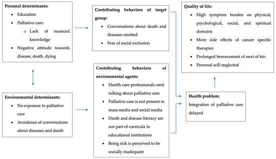 Since stigmatization of palliative care is not limited to the peer group of young adults, the taboo around discussions of palliative care is perpetuated and an open societal discourse is prevented. Therefore, it is not enough to only consider the personal determinants of the target population; behavioral change must also be achieved at the environmental level, e.g., through environmental agents such as healthcare personnel. An intervention to destigmatize palliative care should thus occur in an intrapersonal, interpersonal, and institutional context.