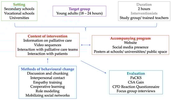 Any intervention aiming at destigmatizing palliative care among young adults should incorporate multiple components. Merely imparting knowledge is unlikely to yield long-term success. Instead, a combination of various approaches appears to be more effective. Through the framework of Intervention Mapping, the following components have been developed in this work: educational training in institutions, creation of informational brochures, interactions with palliative care patients and personnel, public campaigns in communities via posters and social networks, and the establishment of a smartphone-friendly website with information.