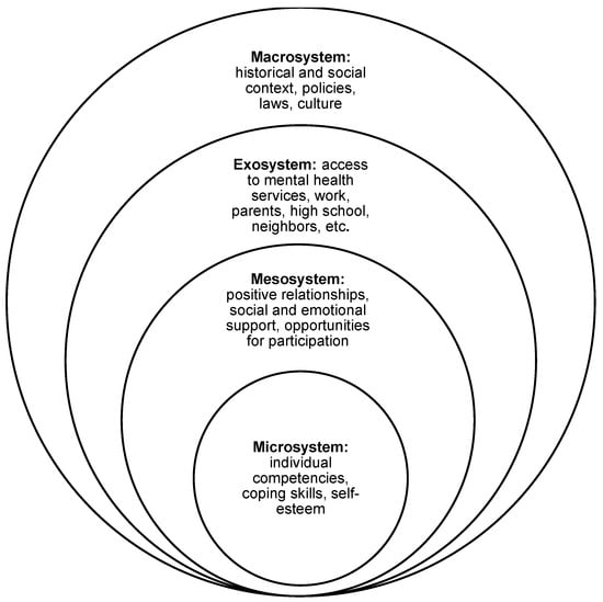 A meta-analysis was not conducted due to the heterogeneity of the populations, the variability in the measurement tools used to assess protective factors, and the limited sample sizes observed in certain studies. A scoping review analysis was used to summarize the results [31]. To describe the studies in which the researchers studied protective factors for mental health in LGBTIQ+ adolescents, we used a thematic framework that included: (1) study data such as design, location, and sampling strategy; (2) sociodemographic characteristics of the sample; (3) protective factors; and (4) consequences or benefits of protective factors on mental health. The protective factors were organized according to Bronfenbrenner’s socioecological model, as proposed by Johns et al. [32] (see Figure 2). Microsoft Excel (version 2016) was used to create a standardized data extraction form from the outlined studies. Lastly, to characterize the investigations and findings, data from each cell were examined.
