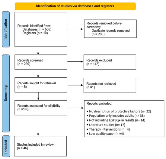 Since our focus is the mental health of LGBTIQ+ adolescents, articles on protective factors for problem behaviors such as drug use or sexual risk were excluded. Additionally, articles that did not include adolescents in their studies or did not discuss adolescents apart from adults, as well as those that only examined risk factors in relation to LGBTIQ+ adolescent health or behavior, were also excluded. Other systematic reviews were not included, nor were single case studies. Finally, gray literature was excluded, as only published and peer-reviewed studies were considered.
