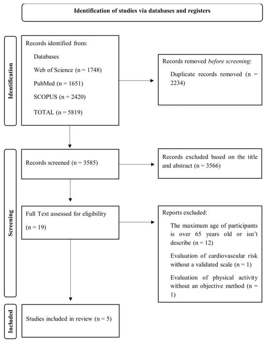 The initial search in the database identified a total of 5819 potentially eligible studies. After excluding studies based on duplicates (n = 2234), titles and abstracts (n = 3566), 19 full-text articles were analysed according to the inclusion and exclusion criteria. Most of the studies excluded were because the maximum age of the participants was over 65 or was not described. After this phase, 14 studies were excluded, and 5 were included in this systematic review.