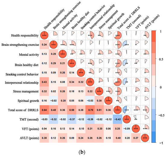 The Spearman correlation analysis of DRRLS scores and neurocognitive scores in SCD and MCI groups showed that the total score of DRRLS was negatively correlated with TMT (r = −0.259, −0.418, p < 0.05) and positively correlated with VFT (r = 0.235, 0.248, p < 0.05) and AVLT (r = 0.295, 0.398, p < 0.01). Among the DRRLS subfields, brain-strengthening exercise, brain-healthy diet, and interpersonal relationship were negatively correlated with TMT (r = −0.315–(−0.389), p < 0.01), while health responsibility, mental activity, smoking control behavior, interpersonal relationship, and stress management were positively correlated with AVLT (r = 0.209–0.377, p < 0.05), as shown in Table 3 and Figure 1. The correlation results have been adjusted with a correction for multiple comparisons.