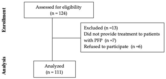 The survey was accessed by a total of 124 individuals, out of which 118 voluntarily participated. Among these participants, seven individuals reported that they did not provide treatment to patients with PFP, and consequently, their data were excluded from the analysis (as illustrated in Figure 1). The demographics and characteristics of the remaining participants (n = 111) are summarized in Table 1. Based on their responses to the item “Have you read the latest Clinical Practice Guidelines for patellofemoral pain?”, participants were categorized into two groups: readers (n = 53) and non-readers (n = 58).