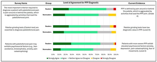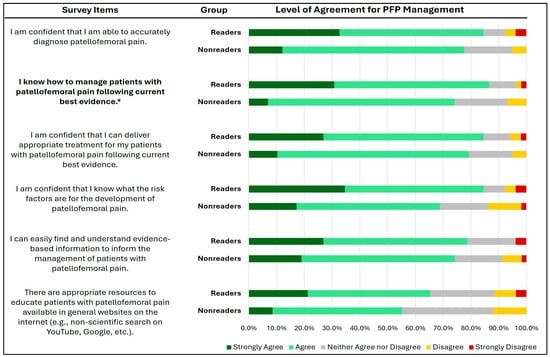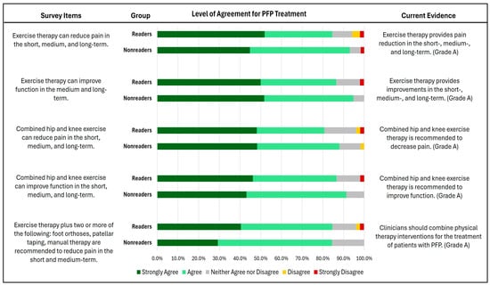 However, only 25.9% of readers and 42.3% non-readers reported agreement regarding the recommendation of electrophysical agents for PFP management. No significant differences were noted between groups across all items (P = 0.08–0.95).