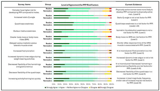 Level of agreement in PFP risk factors between the surveyed physical therapists who have read (readers) vs. those who have not read (non-readers) the Clinical Practice Guidelines.