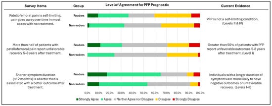 Knowledge of risk factors, diagnosis, and prognosis of PFP among the surveyed physical therapists is shown in Figure 3, Figure 4 and Figure 5. Over 60% of both readers and non-readers agreed with statements related to risk factors and PFP diagnosis. Additionally, more than half of both groups acknowledged that shorter symptom duration (less than 12 months) is associated with better treatment outcomes. However, only a minority in both groups supported statements regarding the self-limiting nature of PFP and the belief that more than half of patients experience unfavorable recovery 5–8 years after treatment.