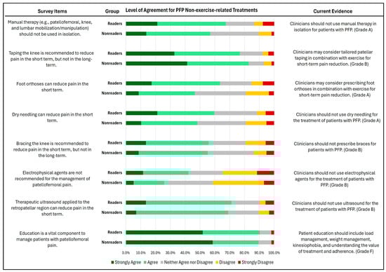 Both readers and non-readers recognized the importance of education in managing PFP, with 90.4% and 89.6% agreement, respectively (Figure 7). Additionally, over half of both groups agreed on the effectiveness of non-exercise-related treatments—such as therapeutic ultrasound, bracing, taping, and manual therapy—for PFP management.