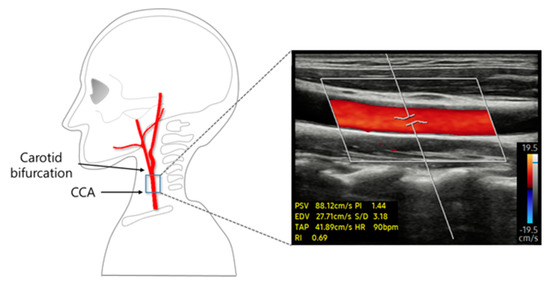 In this study, changes in PSV caused by the modulated stimulation intensity during short-term TENS intervention were assessed using Doppler ultrasound (RS85, Samsung Medison, Seoul, Republic of Korea). All data were obtained from the right CCA. Ultrasonographic measurements were taken 2 cm below the CCA bifurcation site, which was marked after identification using a diagnostic ultrasound. After the location was selected, the specimen was disinfected with an alcohol swab. To measure CCA diameter, axial images of the CCA were obtained using B-mode ultrasound. The PSV was acquired for 30 s in the sagittal plane of the CCA (Figure 3).