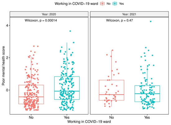 Factorial scores of the poor mental health outcomes index by work in a COVID-19 ward and year of the data collection (2020 vs. 2021).