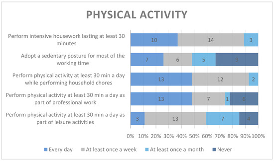 The daily physical activity indicated by nearly half of the participants as most frequent was related to household chores and professional work and the least frequent was leisure activity, chosen by only 3 participants. Nearly half of the respondents declared that they had to maintain a sedentary posture at work every day or at least once a week.