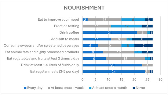 Nearly all respondents reported eating regularly, with 3–5 meals daily, and drinking 1.5 L of liquids daily. More than half of respondents indicated eating fruits and vegetables at least once a week. More than 25% of the respondents declared eating animal-derived fats and highly processed alimentary products every day and almost 50% almost at least once a week. Approximately 22.2% of participants consumed sweets and/or sweetened beverages every day and 25.9% denied consuming any sugar-containing products. Almost all participants declared drinking coffee every day. Approximately 44.4% of the respondents practiced fasting at least once a month and 40.7% at least once a week, whereas 48.1% declared eating to improve their mood at least once a week, 33.3% at least once a month, and 11.1% stated “never”.