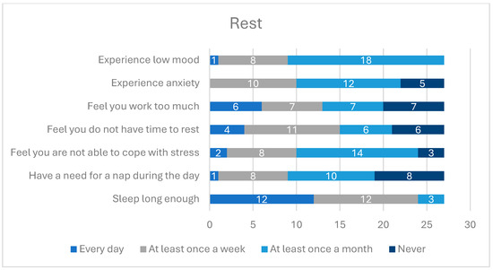 The majority of participants stated that they had satisfactory sleep time every day or at least once a week. Almost the same number of participants indicated that they had difficulties with coping with stress and all participants stated that they experienced lowered or depressive mood, with the most frequent answer being “at least once a year”.