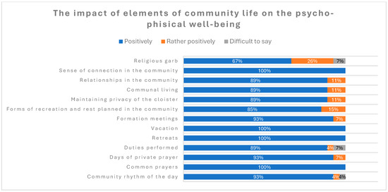 The majority of the respondents considered all of the mentioned elements of community life as having positive or rather positive effects on their psychological and physical well-being, with “Sense of connection in the community”; “Relationships in the community”; and “Community rhythm of the day” indicated as having a most positive impact on their health.