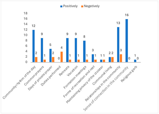 The conclusions of our study are only preliminary, due to the small validation sample size, as the survey was part of preparation for a larger study. However, it already provides an interesting insight into the awareness of health behavior and lifestyle of people living in religious communities. As declared by the majority of participants, living in a religious community can have a positive impact on psychological and physical health, and is associated with having a healthy lifestyle and health-seeking behavior in terms of regular meals and hydration. There is also a high level of awareness of the need for rest and adequate sleep. The main elements of community life that are considered as having the most positive impact on the awareness of health-promoting attitudes are those related to prayer, the rhythm of the day, and a sense of stability.