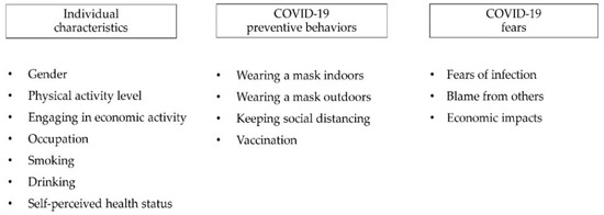 COVID-19-related fears were assessed using three questions that addressed fears of infection (I am worried about getting infected with COVID-19), blame from others (I am worried that if I get infected with COVID-19, I might be blamed or face negative reactions from those around me), and economic impacts (I am worried that the COVID-19 pandemic may cause economic harm to me and my family, including losing jobs or facing difficulties in finding employment). These questions were evaluated using a 5-point scale (1 = strongly agree, 2 = agree, 3 = neutral, 4 = disagree, 5 = strongly disagree). After applying inverse coding, a higher score indicates a greater level of fear. COVID-19 preventive behaviors were assessed using three questions asking respondents whether they adhered to indoor mask-wearing, outdoor mask-wearing, and social distancing over the past week. The responses were categorized into “highly comply”, “comply” and “never”. The analyzed factors of the study are presented in Figure 1.