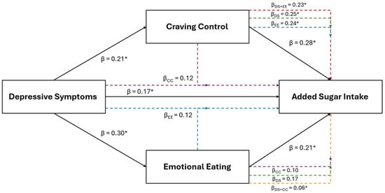 The relationship between depressive symptoms and added sugar consumption in the combined sample of young adults, and the mediating roles of craving control and emotional eating. The black solid lines represent independent associations between variables and the dashed intersecting lines represent the associations after adjusting for other variables presented in the figure. Purple dashed lines represent the association after adjusting for craving control; blue dashed lines represent the association after adjusting for emotional eating; green dashed lines represent the associations after adjusting for depressive symptoms; red dashed lines represent the associations after adjusting for depressive symptoms and emotional eating; and the orange dashed lines represent the associations after adjusting for depressive symptoms and craving control. Standardized β coefficients without subscripts represent the standardized coefficients of the independent associations (affiliated with the solid black lines), while standardized β coefficients with subscripts refer to the associations after adjusting for the mediators. * Ssignificantly associated at p < 0.050